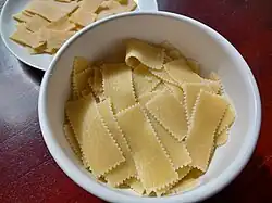 Sagnarelli ([saɲɲaˈrɛlli]) are a type of ribbon pasta originating in the Abruzzo region of Italy.[1] They are typically rectangular ribbons with fluted edges.[2] Sagnarelli are usually served with a cream sauce[3] and their sometimes uneven texture helps to hold thick sauces better.[4]