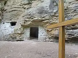 The "Holy Trinity" Monastery of Saharna,[1] situated about 110 km north of Chișinău, on the west side of the Nistru River, is considered to be one of the biggest centres for religious pilgrimages in Moldova. Here can be found the unique relics of the Blessed Macarie, and on the top of the high cliff, according to a legend, there is a footprint of St. Maria, the Mother of Jesus. The legend says that a monk from the monastery once saw the shining figure of Saint Maria on the top of a rock. When reaching that spot the monk saw a mark of a footstep on the ground.