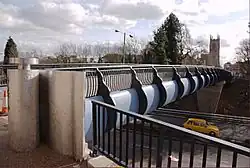 In 2007 Derby City Council demolished and rebuilt the footbridge over St Alkmund's Way to link the city centre with St Mary's Church.[1] It is one of Derby's most-seen bridges and the council worked with Public Artist Denis O'conner and T4 sustainability to design more aesthetically pleasing solution, viewed by an estimated 1,500 pedestrian and 70,000 motorists every day.[1] Funding came from Derby City Council, the Department for Transport and the Derby and Derbyshire Economic Partnership.[1] The final cost was £1.3 million,[2] and the council's contribution was part of a £2 million overspend on highways in 2007.[3]