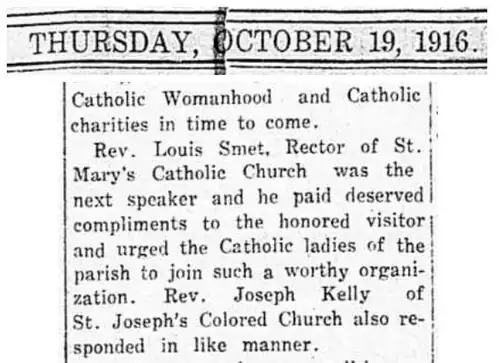 By the turn of the 20th century, Black Catholics at St. Mary's were served by their own priest, Rev. Charles Hannigan of the Josephites, a Catholic society whose mission it was to serve the needs of Native and African-American communities.[6] He traveled from Richmond each week to conduct Mass for the Black Catholics of Alexandria.[7]