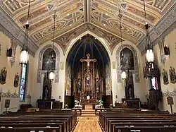 The crucifix hanging from the dome of the apse is 10 feet wide and 12 feet long, with a symbol representing one of the four Gospels at each extremity. Created by a parishioner, it was first hung in the church during the early 1930s.[2]