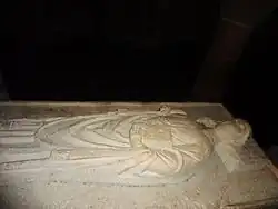The tomb of the first abbot, Gurloës, is located in the center of the crypt. It features a granite base surmounted by a recumbent statue carved in limestone, possibly from the Loire Valley. The recumbent holds a crosier in his right hand, a book in his left, and a dragon at his feet. This tomb is not the one that was built in the hope of promoting the saint's cult at the end of the 11th century: it is clearly a new tomb built at the end of the 14th or beginning of the 15th century. A conduit runs through the base: it was used for the insane and for people suffering from headaches or gout, so that the saint could cure them of their illnesses. Numerous graffiti have defaced the tomb, testifying to the veneration in which Gurloës was held. The tomb, a building by destination, was listed as a historic monument along with the church on the 1840 list.[36]