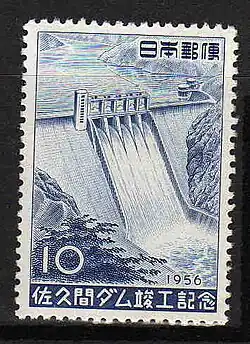After the end of World War II, the American occupation authorities ordered the dissolution of Nippon Hassoden, which was divided into regional power companies. Central Japan came under Chubu Electric Power, which inherited the various dams and projects on the Tenryū River, all of which were located in Nagano Prefecture. To tap into the hydroelectric potential of the river in Shizuoka Prefecture, the government turned to the Electric Power Development Company. The new company, in part through foreign aid loans from the United Nations, began work on a new dam in 1952, based on plans which had begun as early as 1921. The main contractor for the project was Hazama Corporation, and construction was completed in 1956. Construction was facilitated by the steep V-shaped walls of the site, and its proximity to the Iida Line train (several stations of which had to be relocated once the reservoir began to fill. Construction also involved the relocation of 240 households with 296 families. The official opening ceremonies on October 28, 1957 were attended by Emperor Hirohito and Empress Kojun and was the occasion for the issuance of a commemorative postage stamp.