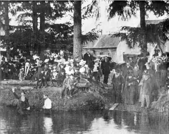 Drury Smith Stayton, an early resident of Sublimity, Oregon, purchased 41 acres of land in 1866 that would eventually come to be known as Stayton.[4] The land was purchased from James Lynch. Unbeknownst to Stayton at the time, an easement existed on Lynch's property, allowing a group from Salem to create a canal to divert water from the North Santiam River to Mill Creek, which was traditionally a seasonal watershed. This allowed settlers of Salem to have access to more water power and permitted year-round operation of the first gristmill and sawmill.[4][5] The digging of the ditch began in 1855 when settlers cut through a gravel bar along the North Santiam, east of present-day Stayton. The high-flowing ditch was historically used for baptisms.