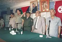 ![]() Opening the course for preparing the organizational staff of the Fatah movement in Tunis (1978) in the presence of Yasser Arafat (center), Salim al-Za'nun (two from right), and Abu Maher Ghneim (far right) | |