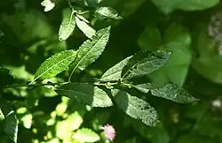 The leaves are divided into a petiole and a leaf blade. The petiole is about 1 inch long. The simple leaf blade is 4 to 18 centimeters long and 3 to 5 centimeters wide[2] obovate to obovate-lanceolate, pointed and gradually narrowed towards the base. The leaf margin is notched or serrated. The upper side of the leaf is deep green, wrinkled and bare except for the leaf veins, the underside of the leaf is scattered hairy with strongly protruding leaf veins. There are 12 to 15 pairs of nerves. The stipules are heart- or kidney-shaped.
