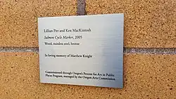 Salmon Cycle Marker is installed at the intersection of Southwest Broadway and Jackson, just west of the Native American Student and Community Center on the Portland State University campus. The abstract sculpture, made of wood, bronze, and stainless steel, depicts salmon in the Columbia River Gorge, and their journey from birth to spawning.[1] Its pole is made from three trees that fell during the 1980 eruption of Mount St. Helens. Images of salmon eggs appear at the base.[1] The middle of the pole shows an image of Pitt's She Who Watches. MacKintosh's depiction of two salmon mating, as well as an abstract image of a salmon, appear at the top of the pole.[1] According to Portland State University, the work is inspired by totem poles, and serves as a metaphor of "regional symbolism".[2]