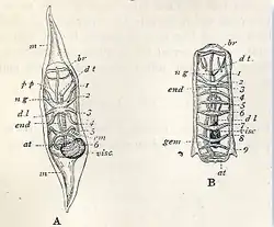 | 1804 illustration by Georges Cuvier of Salpa fusiformis anatomy: A chain form; B solitary form; 1-9 : muscle bands; em - embryo; m - mantle; visc - visceral mass or nucleus | |
