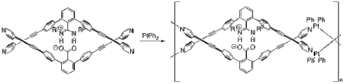 Yashima and coworkers have used salt bridges to construct several polymers that adopt a double helix conformation much like DNA.[25] In one example, they incorporated platinum to create a double helical metallopolymer.[26] Starting from their monomer and platinum(II) biphenyl (Figure 8), their metallopolymer self assembles through a series of ligand exchange reactions. The two halves of the monomer are anchored together through the salt bridge between the deprotonated carboxylate and the protonated nitrogens.
