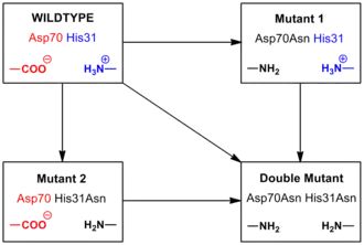 A word of caution when choosing the appropriate experiment involves the location of the salt bridge within the protein. The environment plays a large role in the interaction.[15] At high ionic strengths, the salt bridge can be completely masked since an electrostatic interaction is involved. The His31-Asp70 salt bridge in T4 lysozyme was buried within the protein. Entropy plays a larger role in surface salt bridges where residues that normally have the ability to move are constricted by their electrostatic interaction and hydrogen bonding. This has been shown to decrease entropy enough to nearly erase the contribution of the interaction.[16] Surface salt bridges can be studied similarly to that of buried salt bridges, employing double mutant cycles and NMR titrations.[17] Although cases exist where buried salt bridges contribute to stability, like anything else, exceptions do exist and buried salt bridges can display a destabilizing effect.[11] Also, surface salt bridges, under certain conditions, can display a stabilizing effect.[15][17] The stabilizing or destabilizing effect must be assessed on a case by case basis and few blanket statements are able to be made.