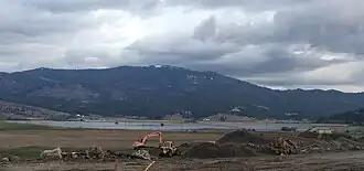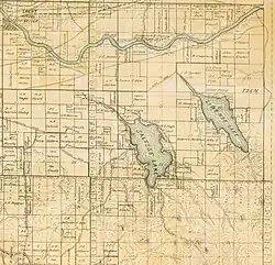 The area known as the Saltese Flats, was once a Lake (even larger than the nearby Liberty Lake), but was drained by Peter Morrison in the 1890s so he could grow Timothy hay on the dry lakebed. Starting in 1894, Morrison used hired laborers and horses to dig 10 miles (16 km) of drainage canals diverting water into Saltese Creek. Within weeks of the canals being finished, the lake had completely drained. The creek, which originally ended at the lake, now carries water an additional 2.5 miles (4.0 km) before terminating at what is now known as Shelley Lake.[4] The Lake—originally spelled "Seltice" Lake—was named after Chief Andrew Seltice of the Coeur d'Alene tribe, who lived in a home on the west side of the lake.[5]