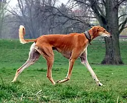 The Saluki or Arabian hound or Persian hound (Persian:سگ تازی، Arabic: سلوقي) is a standardised breed developed from sighthounds – dogs that hunt primarily by sight rather than strong scent – that was once used by nomadic tribes to run down game animals.[2] The dog was originally bred in the Fertile Crescent.[1] The modern breed is typically deep-chested and long-legged,[2] and similar dogs appear in medieval and ancient art. The breed is most closely related to the Afghan hound, a basal breed that predates the emergence of modern breeds in the 19th century,[3] and the Saluki has been purebred both in the Middle East, including by royalty, since at least that era, and in the West (especially in Britain and Germany) since the 1840s (with breed standards established in the West and the Middle East around the 1920s–1930s), though as a free-breeding landrace, similar dogs are common as feral animals in the Middle East. A related standardised breed is the north African Sloughi. The saluki is known as one possible explanation for the mythical Set animal.
