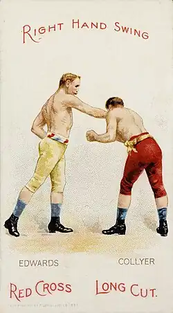 Their third and final contest came on August 8, 1874, in Mill Creek, WV.[20] In the 10th round, Collyer landed a square uppercut that knocked Edwards on his back, ending the round. The 11th came and Edwards appeared winded and was slow to come to the line. As he did, Collyer's seconds noticed something in Edwards hands, and the referee called for him to open them. In the New York Clipper's article from 22 August 1874, covering the fight it said: