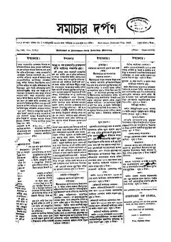 Samachar Darpan (Bengali: সমাচার দর্পণ) was a Bengali weekly newspaper published by the Baptist Missionary Society and published on 23 May 1818 from the Baptist Mission Press at Serampore in the first half of the 19th century. It is considered to be the first Indian-language newspaper, although some historians contend that the Bengali weekly Bengal Gazetti or Vangal Gazette published by Ganga Kishore Bhattacharya had begun publication earlier.