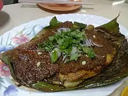 Sambal pari, also known in English as stingray sambal or spicy banana leaf stingray[1] and by the Malay name ikan pari bakar (barbecued stingray fish), is a Malaysian/Singaporean seafood dish. Prepared by barbecuing stingray, it is served with sambal paste atop. Sambal pari can be easily purchased at hawker centers in both Malaysia and Singapore.