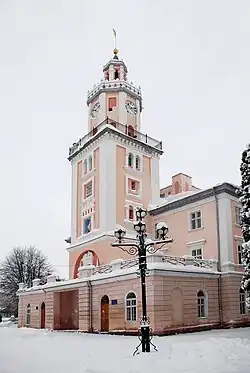 In the center of the market place stood Ratusz (City Hall), with a clock tower on it. This building, the most important in the rebuilt city, was entirely destroyed in 1637 in a fire that wiped out almost all of Sambor. The new Ratusz was completed only in 1668, and then, for the first time, at the top of the tower the city emblem was unfurled: a deer with an arrow in its throat.