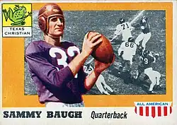 Baugh was also a baseball player at TCU, where he played third base.[1][9] It was during his time as a baseball player that he earned the nickname "Slinging Sammy",[9] which he got from a Texas sportswriter.[1] After college, Baugh signed a contract with the St. Louis Cardinals and was sent to the minor leagues to play with the American Association Columbus Red Birds, after being converted to shortstop. He was then sent to the International League's Rochester, New York Red Wings, St. Louis's other top farm club.[1] While there he received little playing time behind starting shortstop Marty Marion[1] and was unhappy with his prospects. He then turned to professional football.[9]
