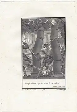 The first mention of Samson comes from a letter of 20 November 1733.[9] Rameau urged Voltaire to finish the libretto as soon as possible and by December it was ready. A notice in the journal Anecdotes ou lettres secrètes shows that Rameau had completed the score by August 1734.[10] By that time there were already doubts about the likelihood of the work being able to pass the censor unscathed. In June 1734 the Parliament of Paris had condemned Voltaire's Lettres philosophiques and the book had been burned publicly in front of the Palais de Justice. Voltaire fled to Cirey to escape imprisonment in the Bastille.[11][12] On 14 September Voltaire's friend Madame du Châtelet wrote that the censors of the Sorbonne had begun to make nitpicking complaints about Samson, for example, Voltaire had attributed some of the miracles of Moses to Samson, he had made fire from heaven fall from the right rather than the left ("a great blasphemy"), and he had only put one column in the Philistine temple instead of the requisite two.[13]