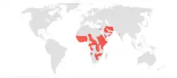 Samsum ants are distributed throughout Africa, the Arabian Peninsula, and Iran.[10] The ants are extensively distributed in Africa,[9] and have been described as the most common ant species in Sudan by Levieux & Diomonde (1978).[5] Originating from Northeast Africa,[11] the species has been found in large populations in Burkina Faso, Cameroon, Democratic Republic of the Congo, Ethiopia, Gambia, Guinea, Iran, Niger, Nigeria, Saudi Arabia, Senegal, Somalia, the United Arab Emirates, and Yemen.[5][1][12] It is an invasive species in the United Arab Emirates and Saudi Arabia, threatening endemic Arabian ant species.[13][11][14] The species was also found in the United States in 1943.[15] Its vast distribution around urban areas in Africa and Asia has led to its being described as a tropicopolitan and cosmopolitan species,[16] and one of the most abundant animals in human settlements in those regions.[17] Its widespread distribution has been attributed to it being one of the only ponerine species to be omnivorous, and having a flexible diet.[18]