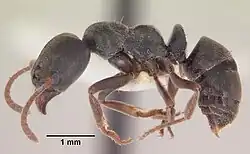 In 1994, Brachyponera was synonymized with genus Pachycondyla,[4] with the ant joining under the name Pachycondyla sennaarensis.[5][6] In the mid 2010s, Brachyponera was revived to full genus status based on morphological and molecular analysis.[4] The ant was again identified to be part of the Brachyponera genus, under the name Brachyponera sennaarensis.[5][6] Samsum ants are ponerine ants.[7][8][9]