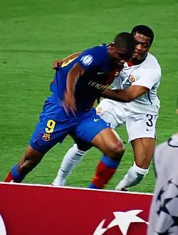 A precocious talent, Eto'o moved to Real Madrid as a 16 year old. Due to competition in his position with more experienced players, he had several loan spells, before signing for Mallorca in 2000 where he scored 70 goals, a club record.[7] His impressive form saw him join Barcelona in 2004 where he scored 130 goals in five seasons and also became the record holder for the most appearances by an African player in La Liga.[8] Winning La Liga three times, he was a key member of the Barcelona attack, alongside Ronaldinho, that won the 2006 UEFA Champions League Final, with Eto'o scoring in the final, and was part of a front three of Lionel Messi and Thierry Henry that won the 2009 UEFA Champions League Final, with Eto'o again scoring in the final. He is the second player in history to score in two UEFA Champions League finals.[9] At Barcelona, Eto'o came in third for the FIFA World Player of the Year in 2005 and was twice named in the FIFA FIFPro World XI, in 2005 and 2006.