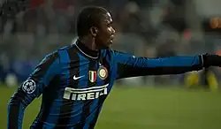 Eto'o scored his first Serie A brace on 29 October during a 5–3 win over Palermo, with Mario Balotelli also scoring twice.[56] On 1 December 2009, Eto'o finished fifth in voting for the Ballon d'Or, which was won by his former Barcelona teammate Lionel Messi.[57] Eight days later, he scored his first UEFA Champions League goal for the team in the final Group F match against Rubin Kazan to help Inter win 2–0 at home and progress to the knockout stage as runner-ups.[58] Eto'o continued to be a protagonist for Inter in Europe, netting the winner in the second leg of 2009–10 UEFA Champions League round of 16 against Chelsea on 16 March 2010, which allowed Inter to progress to the quarter-finals.[59] He scored his first goal in Coppa Italia on 13 April against Fiorentina in the second of semi-finals to help Inter win 1–0 at Stadio Artemio Franchi and progress in the final 2–0 on aggregate.[60] Eto'o won his first silverware with the club on 5 May as Inter defeated Roma 1–0 at Stadio Olimpico to lift the Coppa Italia.[61] His 12 Serie A goals helped Inter claim another championship, the fifth consecutive, after defeating Siena in the final matchday.[62] On 22 May 2010, Eto'o played in the third Champions League final of his career, as Inter won 2–0 over Bayern Munich to win the first title in 45 years; Milito scored both goals, with Eto'o setting up the second.[63] With Inter's triumph over Bayern Munich, he became the only player to win the treble in consecutive seasons with two different teams.[64]
