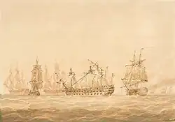 Soon after this Jackson left the service of Sutton and joined the ship of the line HMS Victory, the flagship of the new commander of the Mediterranean Fleet, Admiral Sir John Jervis. Jervis promoted Jackson to lieutenant on 3 November, and he was transferred in that rank to serve in the store ship HMS Alliance.[1][6] He served only briefly in this vessel, re-joining Sutton in Egmont as her most junior lieutenant at the end of the year. The fleet then sailed to Lisbon.[6] On 23 December the fleet was entering the Tagus when one of the ships, the ship of the line HMS Bombay Castle, was grounded on a sandbank after being swept away by a current while avoiding a collision with the store ship HMS Camel.[6][7] An effort to free Bombay Castle was immediately launched and Jackson was given command of Egmont's boats for the operation.[6]