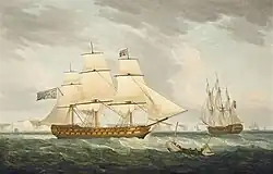 Jackson was given command of a squadron to blockade the American ports and rivers between Cape Fear and Amelia Island. On 23 September, with the brig HMS Mohawk under his command, he used his ship's boats to attack and capture an American gunboat and four merchant ships in a stream that were being protected from land by a force of American militia, while he patrolled between the islands of Cumberland and Jekyll.[39][40] He continued on station, and shortly after 15 January 1815 Jackson sailed up the Chesapeake River and successfully recaptured an East India Company ship, that had recently been taken, finding no resistance from American forces as he did so. The war ended a month later and Jackson sailed for home in Lacedaemonian, arriving at Portsmouth on 4 June. It was calculated that his work in blockade during the war had captured or destroyed £500,000 worth of American goods.[39]