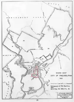 In 1851, Randall assisted his father in the election campaign for a local judge.[7] The judge, a Whig, was elected despite considerable opposition from a candidate of the nativist American Party (commonly called the "Know-Nothing Party").[7] The strength of this group, combined with the Whigs' declining fortunes, led Samuel Randall to call himself an "American Whig" when he ran for Philadelphia Common Council the following year.[7] He was elected, holding office for four one-year terms from 1852 to 1856.[7] The period was one of significant change in Philadelphia's governance, as all of Philadelphia County's townships and boroughs were consolidated into one city in 1854.[10]