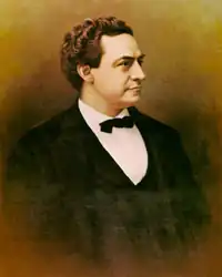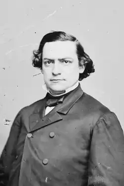 As the Whig Party fell apart, Randall and his family became Democrats.[6] Josiah Randall was friendly with James Buchanan, a Pennsylvania Democrat then serving as the United States' envoy in Great Britain.[11] Both Randall and his father attended the Democratic National Convention in 1856 to work for Buchanan's nomination for president, which was successful.[12] When, in 1858, a vacancy occurred in Randall's state Senate district, he ran for election (as a Democrat) for the remainder of the term, and was elected.[12] Still only 30 years old, Randall had risen rapidly in politics. Much of his term in the state Senate was spent dealing with the incorporation of street railway companies, which he believed would benefit his district.[13] Randall also supported legislation to reduce the power of banks, a policy that he would continue to advocate for his entire political career.[13] In 1860, he ran for election to a full term in the state Senate while his brother Robert ran for a seat in the state House of Representatives.[14] Ignoring their father's advice that it meant "too much Randall on the ticket", both brothers were unsuccessful.[14]