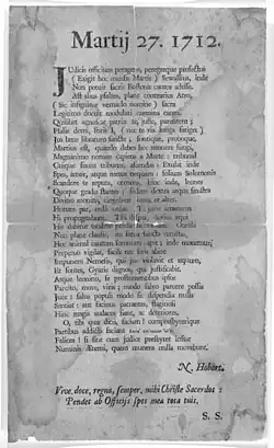 Following the Restoration of Charles II in 1660 to the English throne the Sewalls again crossed the Atlantic, settling in Newbury, Massachusetts.[5] Like other local boys, he attended school at the home of James Noyes, whose cousin, Reverend Thomas Parker, was the principal instructor. From Parker, Sewall acquired a lifelong love of verse, which he wrote in both English and Latin.[6] In 1667 Sewall entered Harvard College, where his classmates included Edward Taylor and Daniel Gookin, with whom he formed enduring friendships. Sewall received his B.A. in 1671 and his M.A. in 1674.[7] In 1674 he served as librarian of Harvard for nine months, the second person to hold that post.[8] That year he began keeping a journal, which he maintained for most of his life; it is one of the major historical documents of the time. In 1679 he became a member of the Military Company of Massachusetts.