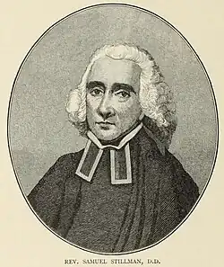 Samuel Stillman (1737–1807) was an American Baptist minister. From 1765 until his death in 1807, Stillman served as pastor of Boston's First Baptist Church of Boston, Massachusetts; for these 42 years, Stillman was considered "the leading Baptist minister in New England, if not the United States."[1][2] Stillman was an original trustee of Rhode Island College (now Brown University) and played a leading role in the establishment of the Massachusetts Baptist Missionary Society in 1802.[2]