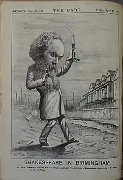 In about 1858, Timmins, the nonconformist preacher George Dawson, J. T. Bunce, J. H. Chamberlain, William Harris, and others in their circle, began to meet for literary and cultural discussions. By 1860, these meetings had been regularised into a more formal club, which in 1862 was named "Our Shakespeare Club". H. R. G. Whates calls Our Shakespeare Club "the intellectual centre of the community, [and] the nineteenth century equivalent of the famous Lunar Society".[5][6] One of the principal achievements of the club, and of Timmins in particular, was the establishment of the Shakespeare Memorial Library within the Central Library in 1864 (the tercentenary year of Shakespeare's birth). The library included a portrait bust of Timmins by F. J. Williamson.[3] The original contents of this library were lost in a fire during 1879, when Timmins was seen sobbing at the destruction.[3] A new Shakespeare Library was created within the new Reference Library built in 1881, and a copy of the bust restored there.