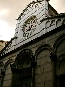 A church at the site is documented since 1053. The architect of much of the structure is attributed to Diotisalvi. The façade has a pattern of alternating white and dark stone, influenced by the style of churches in Pisa. The lower part of the façade dates to 12th-century while the superior façade with a rose window to the 14th-century.[1]