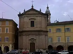 In the second altar on the right is a St Dominic sustained by Angels attributed to Carlo Cignani. From the presbytery one can access the base of the bell-tower with a cycle of 15th-century frescoes depicting the Life of St Catherine by unknown Emilian painters. In the transept are gilded and carved wood altars: one has a 17th-century altarpiece of the Pentecost by an unknown Bolognese painter. A St Lucy in the altar is attributed to Ippolito Scarsella. Another chapel with baroque decor, has a canvas by Biagio Puccini depicting the Incredulity of St Thomas.[2]
