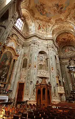 The church, dedicated to St Phillip Neri, was designed by the brothers Pietro Giacomo, Michele, and Domenico Sartorio[1] and built during 1740-1745. The Sartori also completed some of the statuary. The interior is extravagantly decorated, with frescoed surfaces and polychrome altars. The nave ceiling and walls were frescoed (1756) by Carlo Innocenzo Carloni and his studio. The scenes depict the Glory of St Phillip, a Holy Trinity, and the Crucifixion at the apse.[2] The cupola is frescoed with the Assumption of the Virgin and the spandrels with the Evangelists. The wooden choir above the entrance was painted by Federico Ferrari. The organ (1779) was built by the Serassi brothers of Bergamo. Other works are by Giorgio Federico Fochezer and Giovanni Battista Trotti.[3]