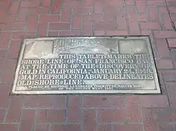 In 1921, a tablet was dedicated by a group of men in downtown San Francisco, marking the site of the original shoreline. The tablet reads: "This tablet marks the shore line of San Francisco Bay at the time of the discovery of gold in California, January 24, 1848. Map reproduced above delineates old shore line. Placed by the Historic Landmarks committee, Native Sons of the Golden West, 1921."[18]