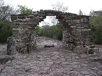 This arch is the main entrance from the north and west to San Gervasio’s District 1 Central Plaza Group. It is a simple arch about seven feet tall that straddles the main religious pathway (called a sacbe in Mayan, a word meaning "white road") running northeast from the plaza. It was reconstructed by INAH in the form of similar arches found at other sites on the east coast of Quintana Roo, such as El Cedral, located on the southern portion of Cozumel.[9]