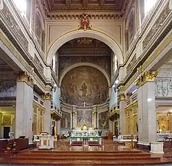 The interior is in a Baroque style, with Corinthian columns in pinkish-grey Baveno granite with gilded capitals. Stained glass windows depict Pope Pius IX, Pope Pius X and Pope Benedict XV. Mosaics in the apse were added in 1964 to designs by Pio and Silvio Eroli, with scenes from the life of Saint Joseph.[19] The spandrel of the triumphal arch shows Christ in majesty with scenes featuring the four patriarchs Abraham, Isaac, Jacob and Joseph, son of Jacob.[20] Silvio Consadori added twelve frescos in 1971.[21]
