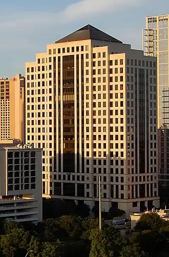 The San Jacinto Center's office tower and hotel component opened on January 14, 1987, with a ribbon cutting ceremony heralded by Austin mayor Frank C. Cooksey and Four Seasons Hotels founder Isadore Sharp.[2] There was originally supposed to be twin office towers; the eastern office building was canceled during the economic downturn of the early 1990s.[3] In 1996, a Houston-based firm planned to buy the parcel of the unbuilt tower. Two San Jacinto Center was to be built to the exact specifications of the existing office tower as originally planned, however, plans fell through and the tower was never built. In 2000, a residential tower was planned for the site of the unbuilt twin tower, but the plans were eventually shelved.[4]