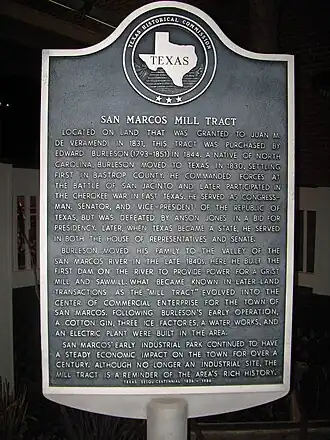 The property was later purchased in 1844 by Edward Burleson, where he built the first dam on the San Marcos River, simultaneously providing power for a grist mill and sawmill. The tract was later used as a cotton gin, three different icehouses, a waterworks, and an electric power plant. The tract evolved into an industrial park, substantially impacting the local economy.