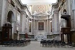 It has a single nave with three chapels on each side. The interior is richly decorated with stucco, though its main features are its 18th-century high altar. The high altarpiece is surmounted by three paintings - Niccolò de Simone's 1654 Saint Potitus pierced by a burning nail making the emperor Antoninus share his pain, flanked by Giacinto Diano's 1784 Saint Potitus felling an idol and Saint Potitus curing the madness of Antoninus' daughter Agnes.[1] Diano also painted a 1791 depiction of the Immaculate Conception in the third chapel on the right, whilst in the first chapel on the right is Luca Giordano's 1663-65 Our Lady of the Rosary. A 17th-century Calvary is in the first chapel on the left, the second chapel on the left has stucco depicting Saint Cajetan and the third chapel on the left has a painting of Our Lady with Saints Antony the Great and Roch by Andrea Vaccaro. The sacristy contains two paintings by Pacecco de Rosa and Domenico Mondo.[2]