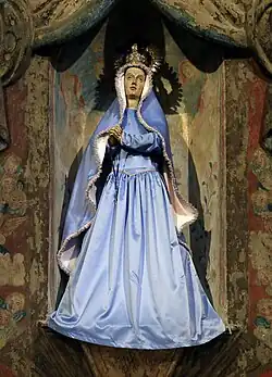 The mission was rebuilt between 1783 and 1797, which makes it the oldest European structure in Arizona. Labor was provided by the O'odham.[1] An outstanding example of Spanish Colonial architecture in the United States, the Mission San Xavier del Bac hosts some 200,000 visitors each year.[1] It is a well-known pilgrimage site, with thousands visiting each year on foot[4] and on horseback, some among ceremonial cavalcades or cabalgatas.