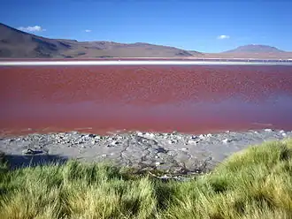 ![]() Laguna Colorada ("colored lake") as seen from the south with Sanawrya in the background (on the right) | |