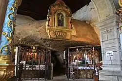 The main chapel, elevated another three steps, is integrated into a large boulder, with two small retabular structures, dedicated to the Menino Jesus ('Baby Jesus') and Senhora da Boa Morte ('Our Lady of Good Death'), protected by iron grades, an oratory and nativity. Over the boulder is an oratory dedicated to Nossa Senhora das Dores ('Our Lady of Sorrows'). To the left is a doorway access to the Chapel of the Holy Sacrament, surmounted by a relief coat-of-arms, while flanked by pilasters topped by sculptures of lions is the arcosolium and grave of Pedro do Soveral. Immediately opposite is the small door to the sacristy, with a staircase access to the bell tower. The nativity, inset in the boulder, is protected by glass doors. The small cove with the Sagrada Família and Adoration of the Shepherds and central to the diorama, with Glória de Anjos and Deus Pai above, while to the left, is the Fuga para o Egipto ('Flight to Egypt'), while in the upper right is the cortege of the Wise Men, descending.[2]