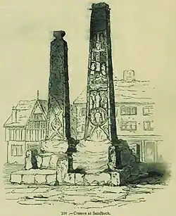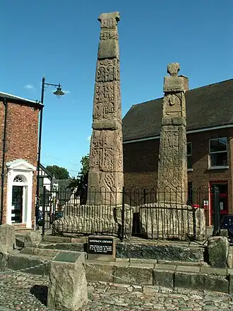 The Sandbach Crosses are two 9th-century stone Anglo-Saxon crosses now erected in the market place in the town of Sandbach, Cheshire, England.[1] They are unusually large and elaborate examples of the type and are recorded in the National Heritage List for England as a designated Grade I listed building,[2] and a scheduled monument.[3]