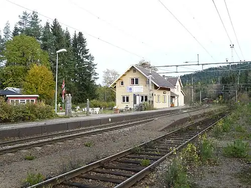 Sandermosen Station (Norwegian: Sandermosen stasjon) is a formerly staffed station on the Gjøvik Line located in Maridalen, Oslo, Norway. The station, which formerly had its own station building, is situated just under 16 km from Oslo Central Station between Kjelsås Station and Snippen Station. It was opened in 1909 and closed on 11 June 2006. Since its closure, Snippen has become the nearest station. The area was used as a loading zone as early as 1900, two years prior to the opening of the Gjøvik Line. Today, the station and the station building serve as a hub for cultural activities in the area, promoted by kulturPUNKTET Sandermosen stasjon. A sculpture park is situated next to the track.[1]