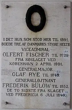 A third plaque commemorates that Vice Admiral Olfert Fischer (until 1829), Major-General Olaf Rye (until 1849) and Lieutenant-General Frederik Büllow all lived in the building that stood at the site until 1892. Fischer commanded the Danish fleet in the Battle of Copenhagen on 2 April 1801 while the two others participated in the Battle of Fredericia on 6 July 1849.
