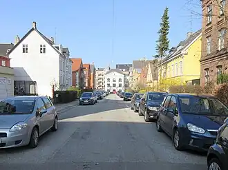Henning Wolf, Frederiksberg's first city architect, created a masterplan for a neighbourhood of single-family detached homes on the north side of Gammel Kongevej in the 1960s.[1] The neighbourhood was initially referred to as Frederiksberg Villa Quarter but the name passed out of use in around 1890. Sankt Knuds Gade was created in around 1867–68. It was named after Saint Canute. The name was proposed by a lot owner. The streets Platanvej, Niels Ebbesens Vej and Bernstorffsvej (now part of Danasvej) were created around the same time. Alhambravej and Hauchsvej were created in 1870.[2][3]