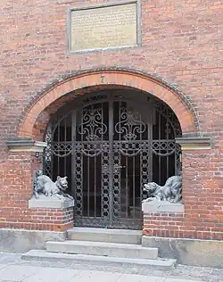A new building for the school was inaugurated at Larslejsstræde 5 in 1899. The complex also comprised a new home for Skt. Petri kirkes, Thymes og P.s plejestiftelse, a home for elderly indigent, German expatriates. It had been established in the beginning of the 19th century through a merger of three independent institutions: Thymes Stiftelse ('Thyme's Foundation'), founded by Winand Thyme in 1775; Pelts Stiftelse ('Pelt's Foundation'), founded by Abraham Pelt in 1779; and a third one operated by the church.[2] Most of the residents were German expatriate women. In 1997, the building was sold to the school, which needed more space for its increasing number of students.[3]